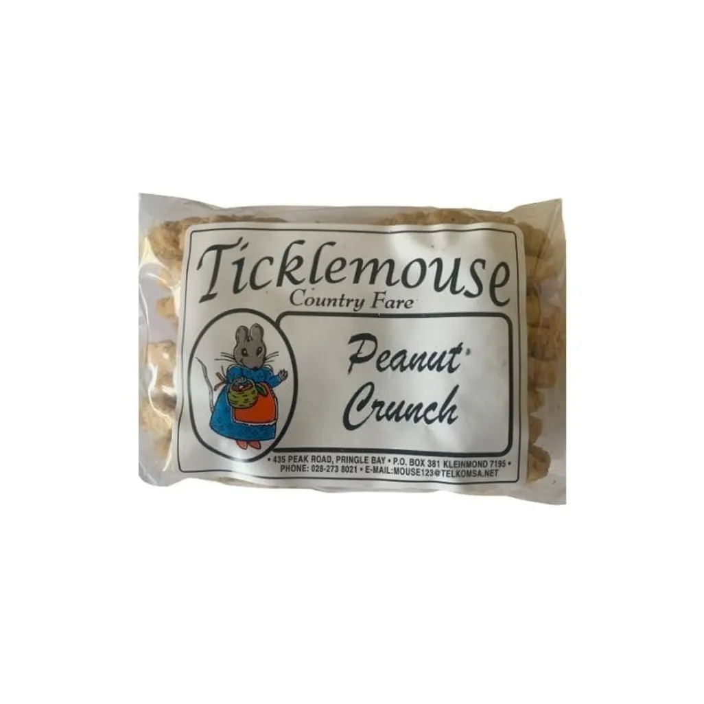 The Ticklemouse Peanut Crunch are light, brown crisp single biscuits. Made of wheat flour, eggs, oats, salt, milk and peanuts, and they are baked with love.