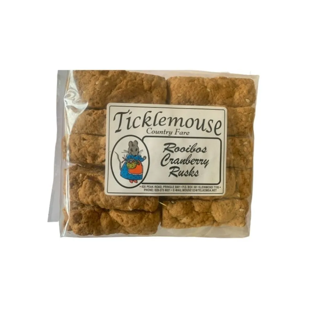 The pack of Ticklemouse Rooibos Cranberry Rusks is a ready to eat treat, that is perfect for any occasion. Made of wheat flour, buttermilk, eggs, cranberries and rooibos, and they are baked with love.