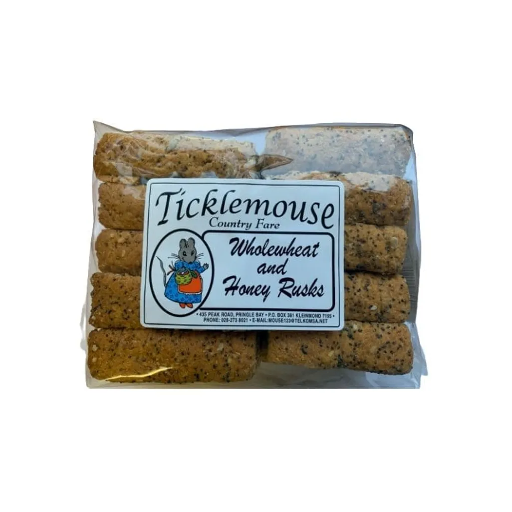 The pack of Ticklemouse Wholewheat & Honey Rusks is a ready to eat treat, that is perfect for any occasion. Made of wheat flour, buttermilk, eggs, bran, wholewheat and honey, and they are baked with love.