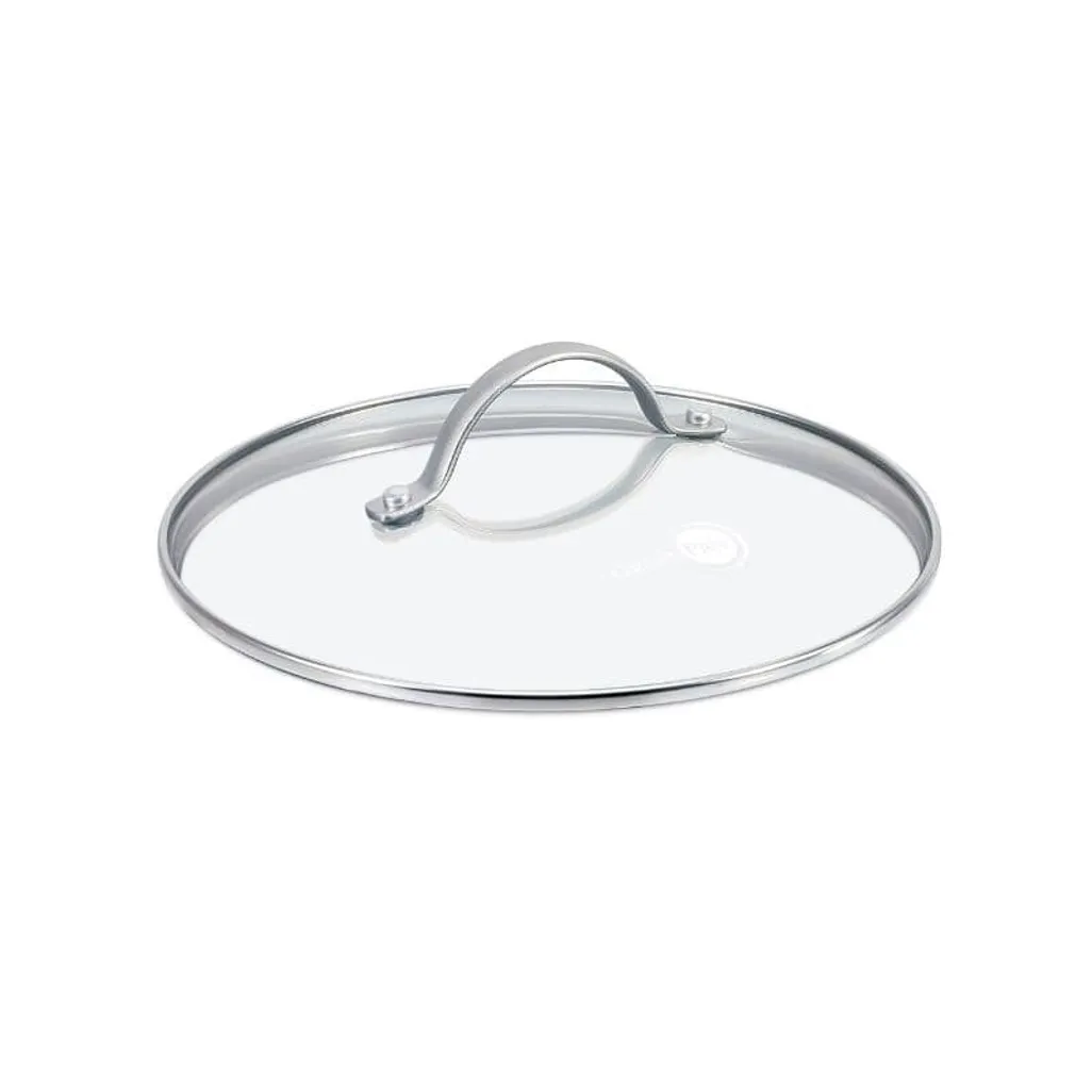 The Green Pan Cambridge 28cm Glass Lid is made of tempered glass, which is oven-safe up to 200°C. This glass lid has a stainless steel handle, and it allows for easy food monitoring.