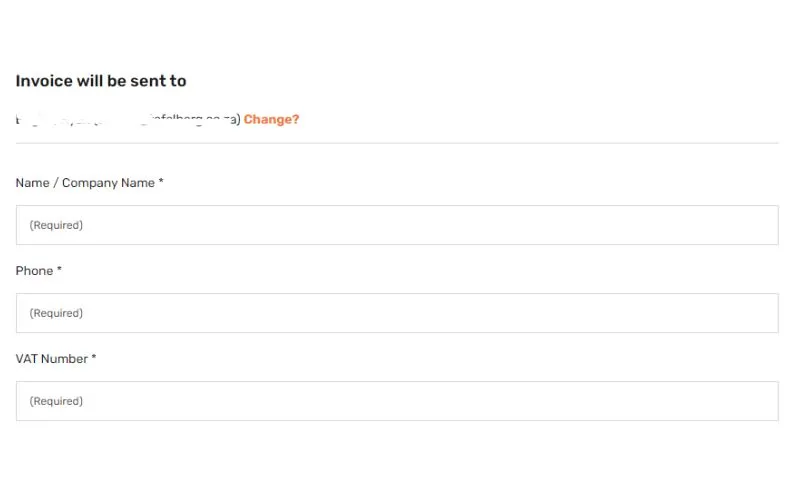 If the order is for a company, and you would like your VAT number to be added to the invoice, you can select the "change" icon, and fill in the necessary details, such as the company name, contact number and VAT number.