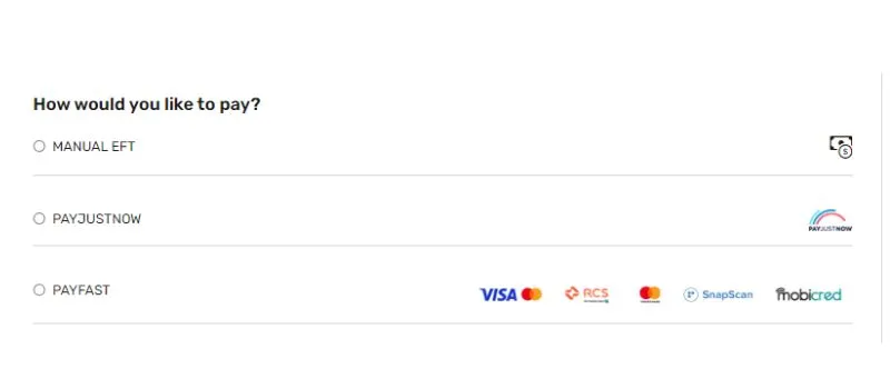 PayFast - allows you to pay for your order using your credit or debit card, or Mobicred or RCS etc.