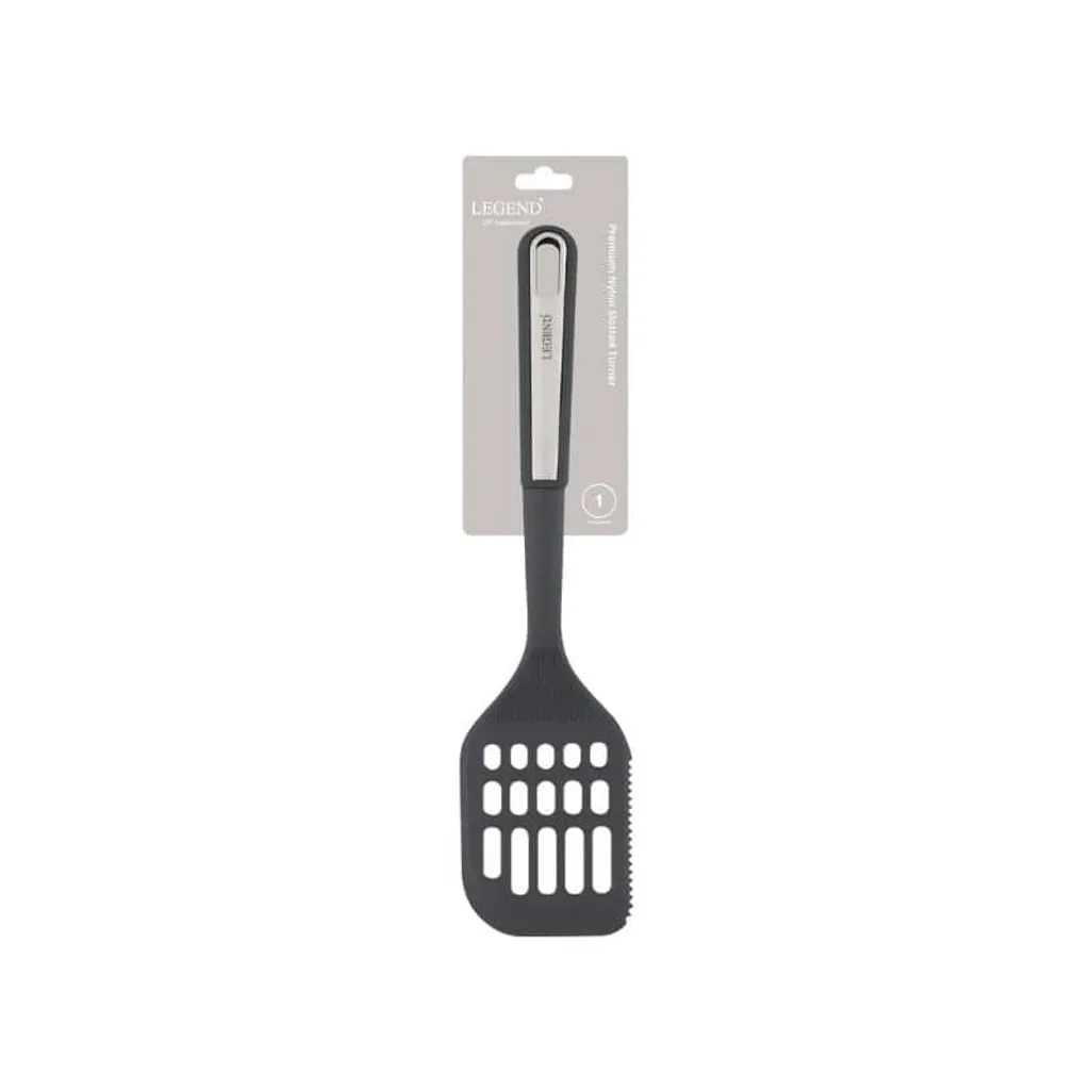 With the Legend Premium Nylon Slotted Turner, you can turn and serve your food. The slotted turner is ideal for making burgers, pancakes, eggs and you can remove biscuits from a baking tray. The slotted turner has a comfortable soft handle with stainless steel accent, and the tip of of spoon has a rounded corner for ease of use in the pan. Glass fibre additives provides extra strength. The premium design has an integrated grater for ginger and garlic and serrated edge to cut meat and vegetables.