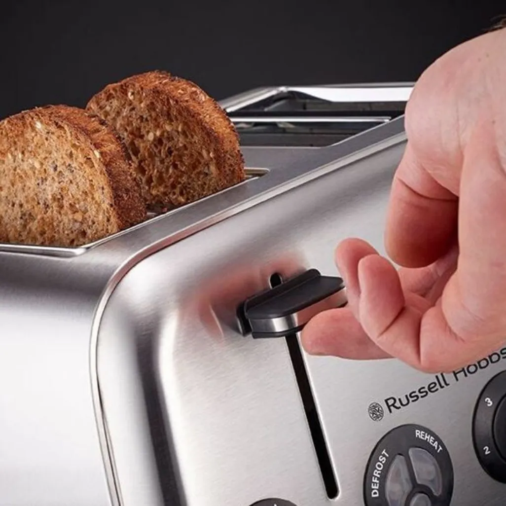 The Russell Hobbs 4 Slice Stainless Steel Toaster has 6 browning levels so that you can select how brown you want your toast to be. Thanks to the additional defrost function of the toast, you can defrost your toast and you can toast it, while the reheat function warms cold bread or further browns just toasted bread.