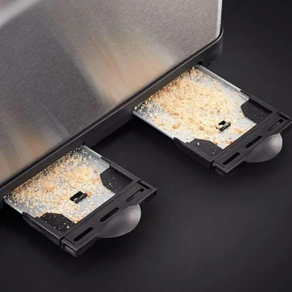 The Russell Hobbs 4 Slice Stainless Steel Toaster has two crust trays that can easily be removed in order to clean and remove the crumbs that accumulate at the bottom of the 4 slice toaster.